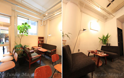 沢山のテーブル席のすみに、まったりできそうなソファー席が2っ。