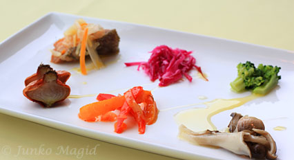 前菜6種盛り合わせ。どれも素材の味が生きていて、目にも楽しい。