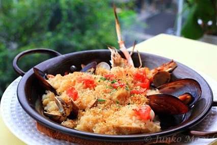 魚介リゾットのオーブン焼き。スキャンピ・ムール貝・浅利・帆立・イカなどなどが沢山入っています。海の幸のうまみがぎゅ〜っと詰まっていて、と〜っても美味しかったです!
