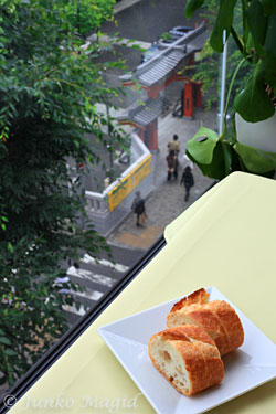 窓側の席からは、神楽坂を情景や毘沙門様を、上から眺められます。